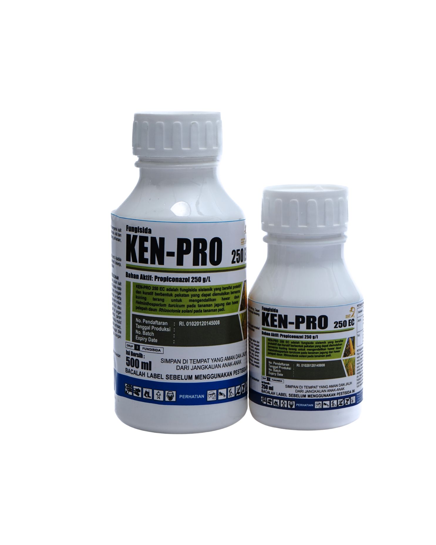 KEN-PRO 250 EC adalah fungisida sistemik yang bersifat protektif dan kuratif berbentuk pekatan yang dapat diemulasikan berwarna putih untuk mengendalikan hawar daun (Helminthosporium turcicum) pada tanaman jagung dan hawar pelepah daun (Rhizoctonia solani) pada tanaman padi.